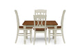 The 5-Piece Monarch Rectangular Dining Table and Four Double X-back Chairs by homestyles blends upscale design with functionality. This stylish dining set blends hardwood solids, engineered wood, and veneers with a rubbed off-white, nine-step distressed oak finish. This set projects striking style with sophisticated, solid wood turned legs with intricate carved detail. Equipped with an 18" removable leaf. Chairs are packed two per carton. Set includes dining table and four double X-back chairs. Assembly required.