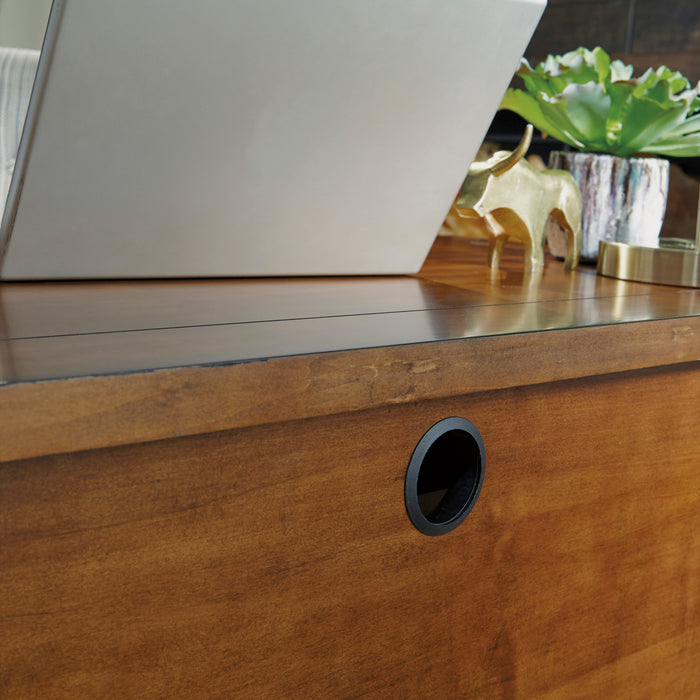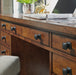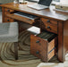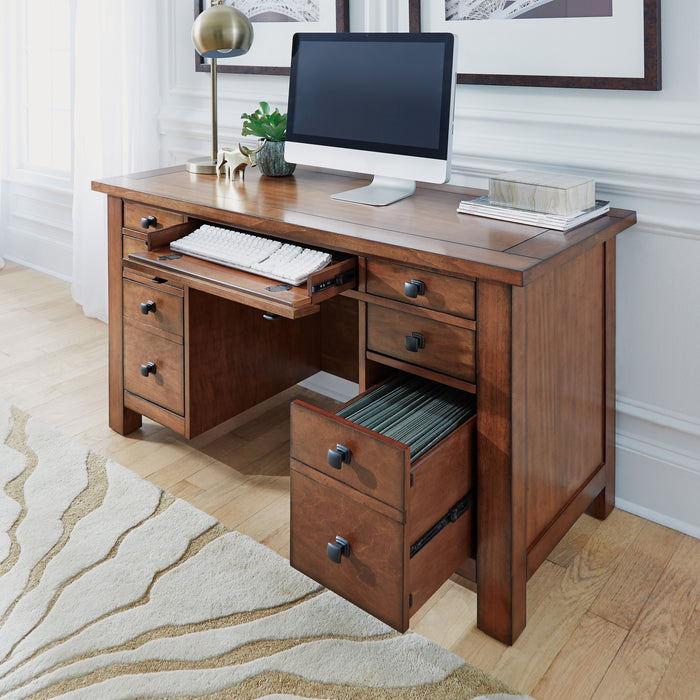 Bring the classic home office look to your space with the Homestyles Tahoe Pedestal Desk. The poplar with distressed aged maple finish is accented by oak veneers and strengthened with engineered wood for the ultimate in form and function. This desk offers plenty of desktop space and versatile storage, including two file cabinets and a keyboard tray. Elevate your home office with this beauty.