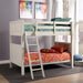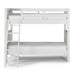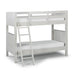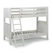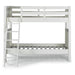 Transitional design that works in any décor. Crafted of solid hardwoods, laminated veneer lumber, and engineered woods, finished in an off-white satin painted finish. Laminated veneer lumber is a construction grade product used to make beams for framing and is stronger and more durable than solid wood. It is used in key areas for added strength and safety. Bed includes floor to top bunk angled ladder, for easy access to top bunk, and includes slates for mattress support, mattresses not included. Duel frame paneled headboard and footboard for added design element with dual rail upper bunk side protection for safety and stability. Note finish and measurements may vary slightly, assembly required.